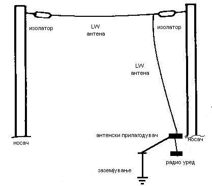 За LW антената ефективно да зрачи во етер неопходно е да има добро заземјување (Слика – 1) или да се постават најмалку еден или уште подобро повеќе радијали со должина која зависи од работните фреквенции на кои се употребува, обично една четвртина од брановата должина (Слика – 2).